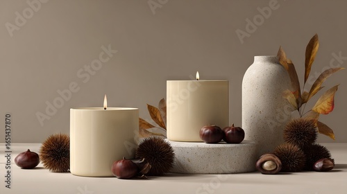 Elegant arrangement of candles, decorative vase, and chestnuts on a neutral surface, showcasing autumnal elements and warm ambiance for seasonal decor inspiration