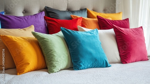 Elegant arrangement of colorful pillows enhances the cozy bed ambiance. The colorful pillows add a touch of style, providing a perfect photo style with ample copy space.