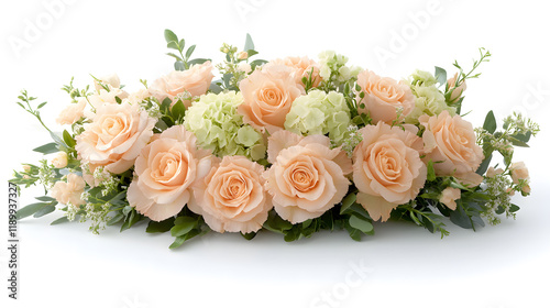 Elegant arrangement of peach roses and green hydrangeas, perfect for weddings or special occasions. Lush greenery complements the delicate blooms, creating a romantic and sophisticated centerpiece.