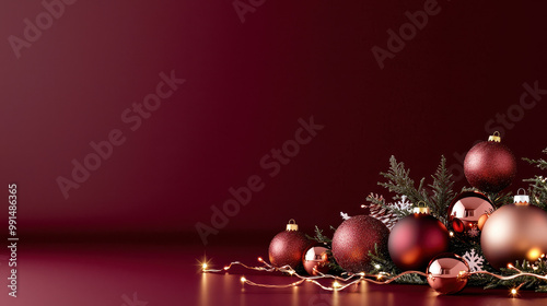 Elegant arrangement of shimmering Christmas ornaments in rich reds and golds, surrounded by green pine and delicate snowflakes