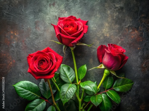 Elegant Arrangement of Three Red Roses with a Bud Against a Textured Dark Background, Perfect for Floral Themes and Romantic Decor
