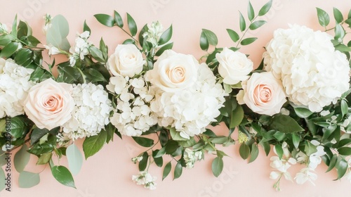 Elegant arrangement of white roses, hydrangeas, and greenery on a pink background.