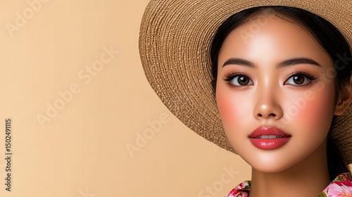 Elegant Asian woman with natural makeup, wearing a floral blouse and a wide-brimmed hat, with a beige background highlighting her calm elegance.