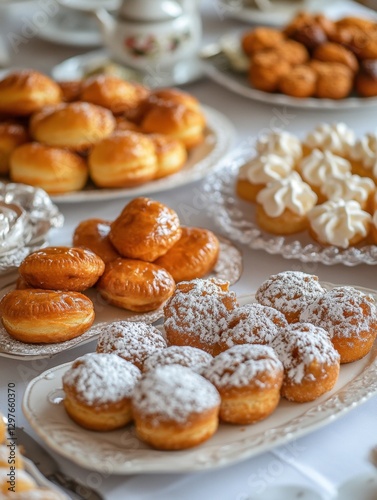 Elegant assortment of sweet pastries on ornate plates showcasing a delightful variety of textures and flavors in a bright setting