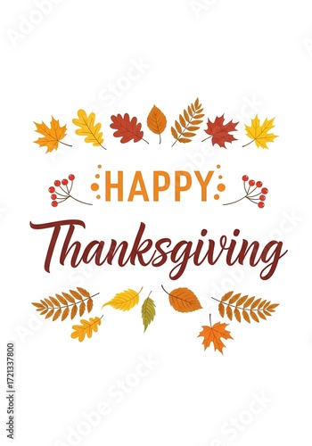 Elegant Autumn Harvest Celebration Design with 'Happy Thanksgiving' Typography and Decorative Seasonal Leaf Accents, Perfect for Cards and Banners