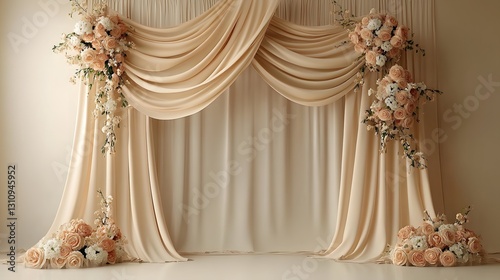 Elegant backdrop featuring draped fabric and floral arrangements on display