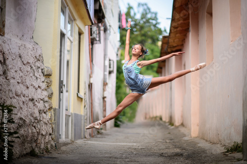 Elegant ballet dancer girl dancing ballet in the city