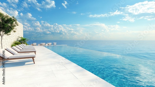 Elegant beachfront pool area with modern sunbeds, infinity edge flowing into ocean blue