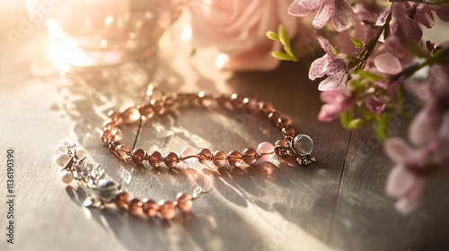 Elegant beaded bracelets and earrings shining in sunlight with flowers