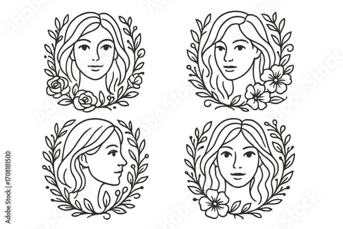 Elegant Beauty Woman Faces in Floral Wreath Line Art, Botanical Frame, Abstract Female Portraits, Flowers and Leaves Border, Minimal Vector Illustration, Modern Black Outline, Transparent Background