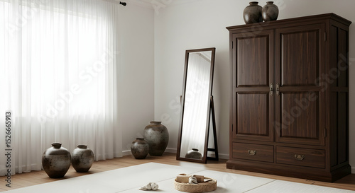 Elegant Bedroom Corner With Wooden Wardrobe and Decorative Vases