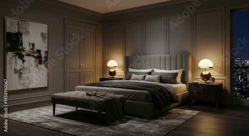 Elegant Bedroom Design: Serene Nightscape, Modern Luxury & Abstract Art Decor Inspiration