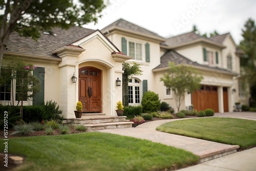 Elegant Beige House with Brown Wooden Door, Landscaped Yard, and Stone Walkway