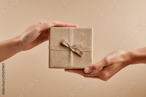 Elegant beige square gift box with ribbon and bow is carefully presented
