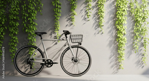 Elegant bicycle against a textured wall with cascading vines, evoking serene urban lifestyle
