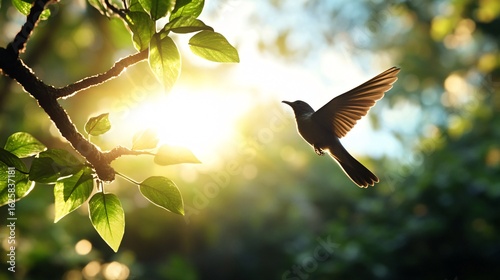 Elegant Bird in Flight Surrounded by Sunlit Greenery and Leaves