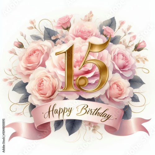 Elegant birthday design with roses featuring the number 15 and a ribbon that reads 'Happy Birthday'.