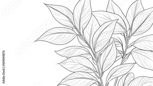 Elegant black and white botanical illustration featuring detailed leaves and stems. Intricate line work creates a lush, organic design