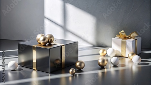 Elegant black and white gift boxes with gold accents and decorative spheres in sunlit room
