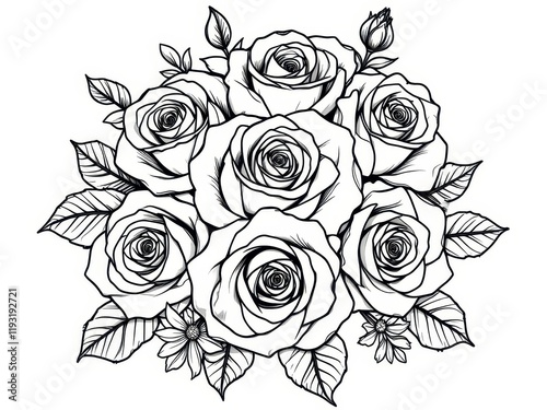 Elegant Black and White Line Art Drawing of a Lush Rose Bouquet