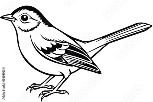 Elegant Black and White Line Art Illustration of a Standing Bird with Details