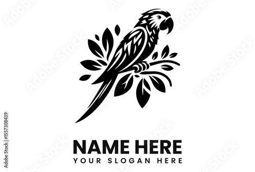 Elegant black and white parrot logo design, perched on a branch amidst stylized leaves.