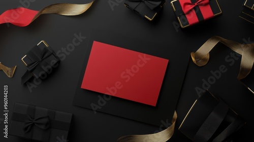 Elegant Black Friday mockup with blank red card and luxurious black gift boxes on dark background