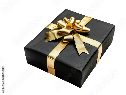 Elegant black gift box with a polished gold ribbon, perfect for celebrations, birthdays, and special occasions. Isolated on a white background.
