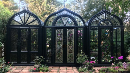 Elegant Black Gothic Greenhouse with Stained Glass Doors