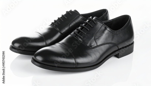 Elegant black leather dress shoes reflect light against a clean background, conveying sophistication and timeless style.