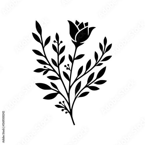 Elegant Black Rose and Foliage Silhouette on White, Vector Graphics