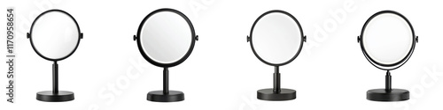 Elegant black round vanity mirror standing on bathroom vanity counter against white tiled wall in modern minimalist bathroom interior design