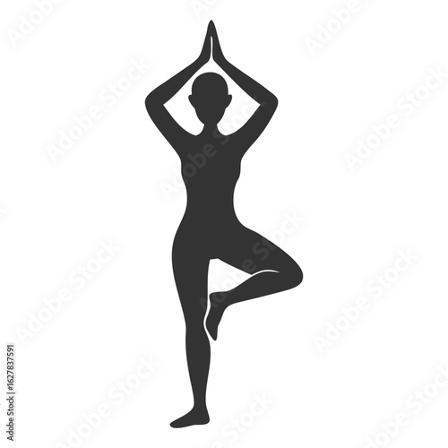 Elegant black silhouette of a woman in tree pose with hands in prayer, ideal for yoga, wellness, or meditation designs.