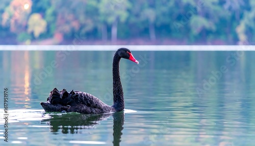 Elegant Black Swan Gliding on Calm Lake Waters with Forest Reflection
