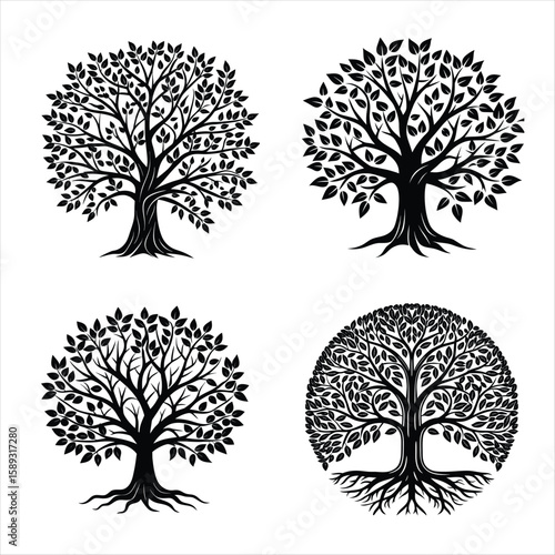 Elegant Black Tree Silhouette Set with Leaves and Roots