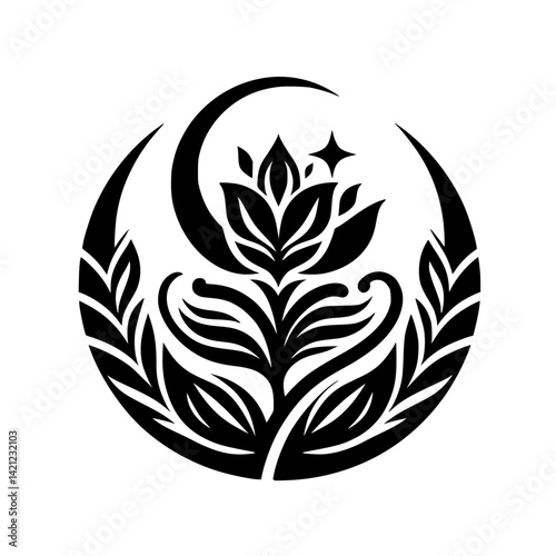 Elegant Black White Celestial Flower with Crescent Moon and Stars Vector Symbol