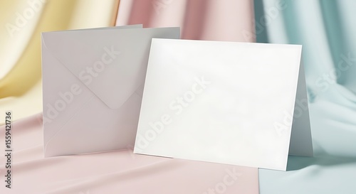 Elegant blank card with envelope mockup on pastel silk background for greetings