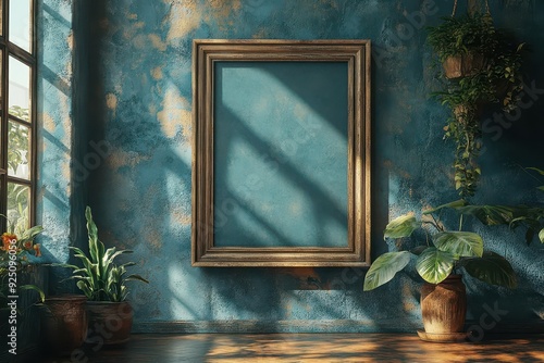 elegant blank picture frame on textured wall soft ambient lighting creates subtle shadows perfect for showcasing artwork