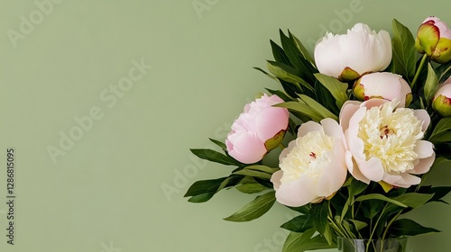 Elegant Blooming white and pink peonies set against a soft teal background refreshing and elegant with a hint of vintage charm