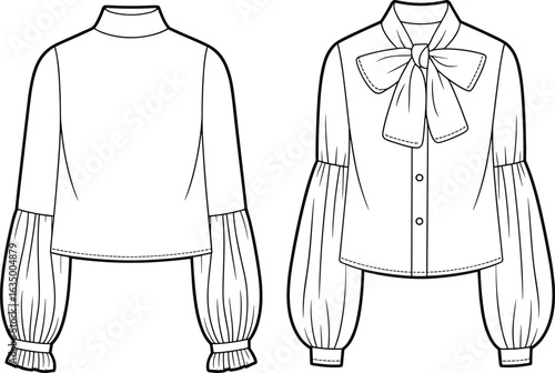 Elegant blouse fashion CAD with puff sleeves, flat sketch, bow tie detail, front and back views, technical drawing, vector illustration