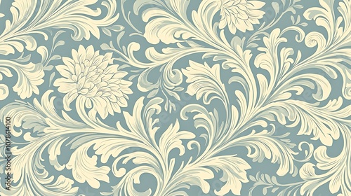 Elegant Blue and Cream Floral Damask Pattern with Swirling Leaves and Blossoms Ideal for Vintage-Inspired Interior Design and Textiles