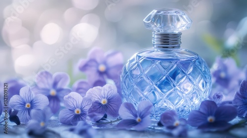 Elegant Blue Perfume Bottle Surrounded by Delicate Purple Flowers