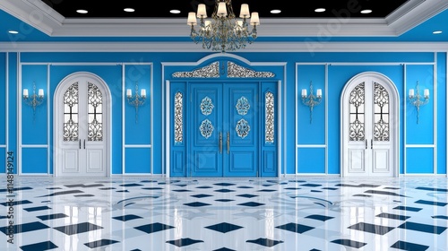 Elegant Blue Room Interior Design Grand Doors Marble Floor Luxury Home Decor