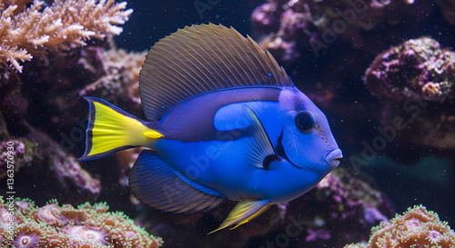 Elegant blue sailfin tang swimming gracefully near coral reef environment