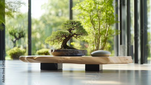 Elegant bonsai tree on wooden platform in modern interior