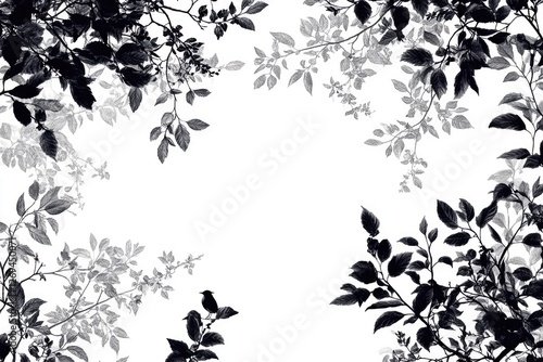 Elegant Botanical Border with Silhouette Leaves and Bird on White Background