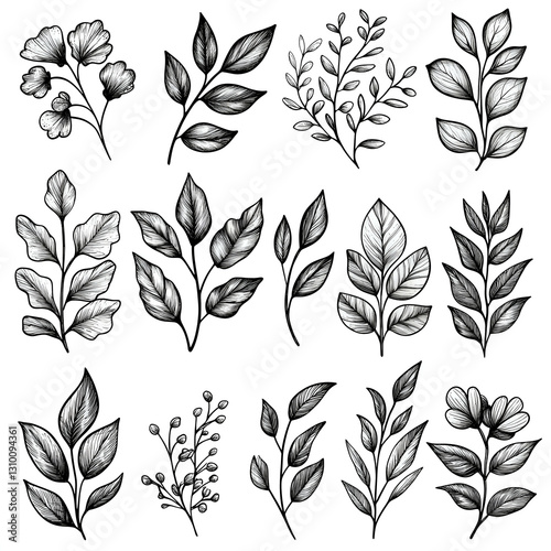 Elegant Botanical Illustration: Black and White Floral Design Featuring Hand-Drawn Leaves and Wildflowers