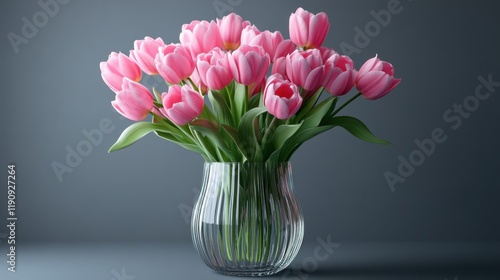 Elegant bouquet of pink tulips in a clear glass vase with subtle lighting