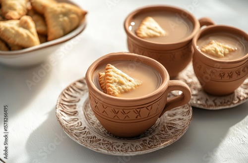 Elegant breakfast scene of masala chai in clay cups, served with biscuits and mini samosas