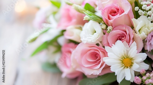 Elegant Bridal Bouquet with Soft Pink Roses and White Daisies on Rustic Wooden Table : Generative AI